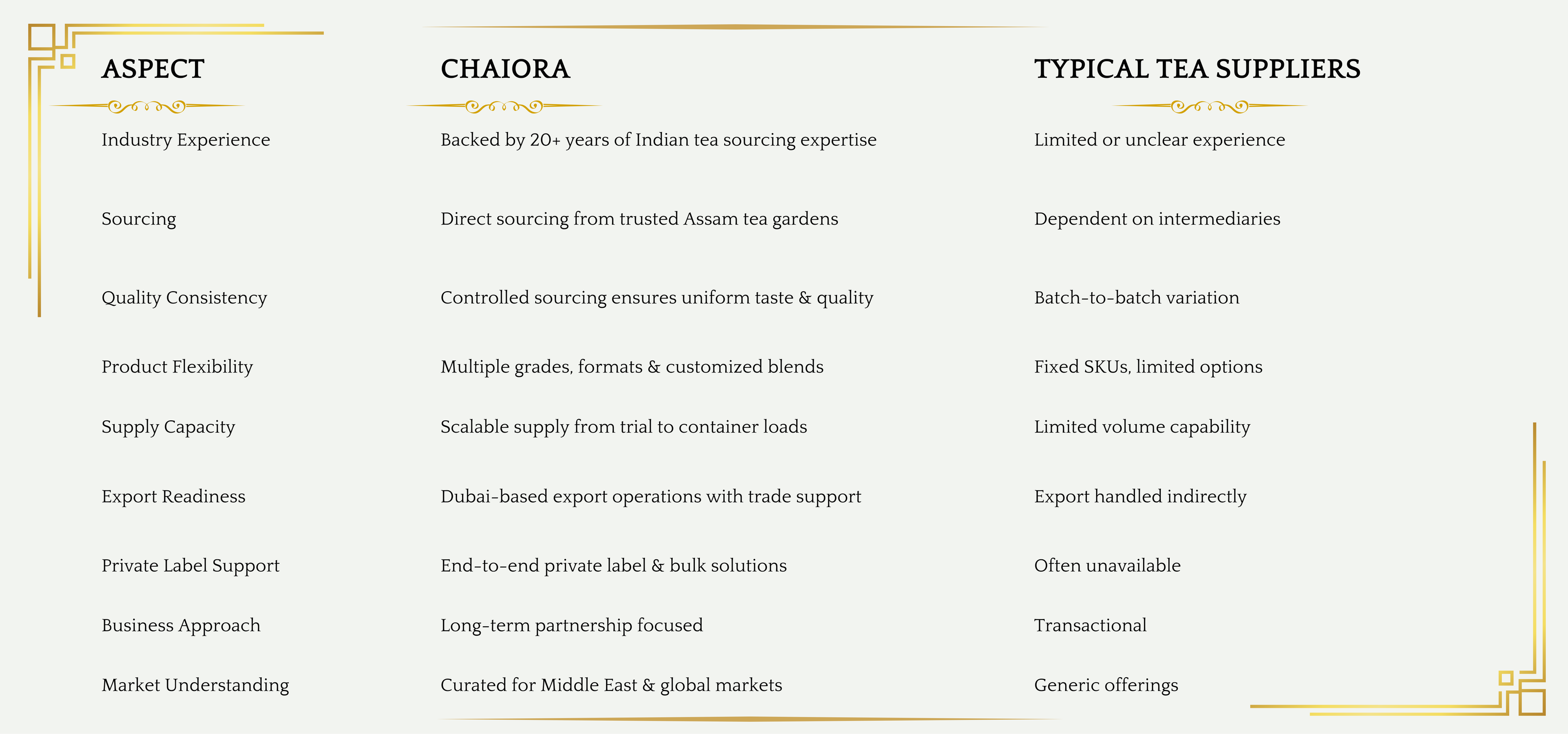 Chaiora brings together decades of Indian tea expertise and Dubai-based export capabilities to offer reliable, scalable tea solutions for global markets